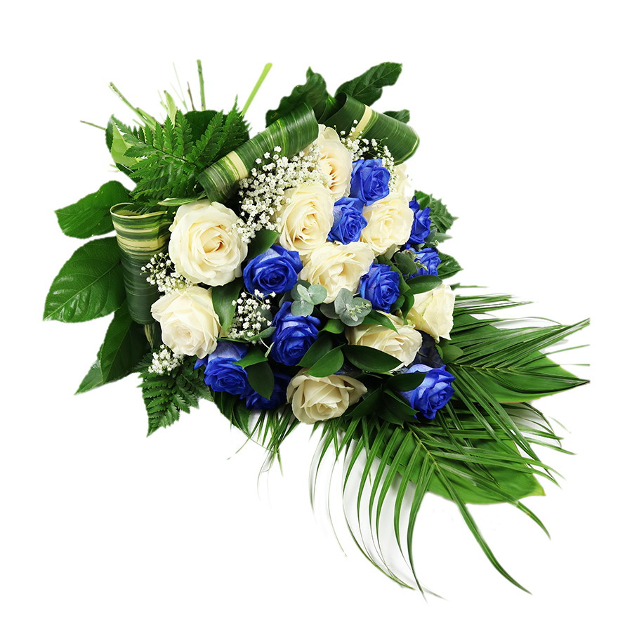 Express your deepest sympathies with this elegant spray made up of gentle white and blue roses.