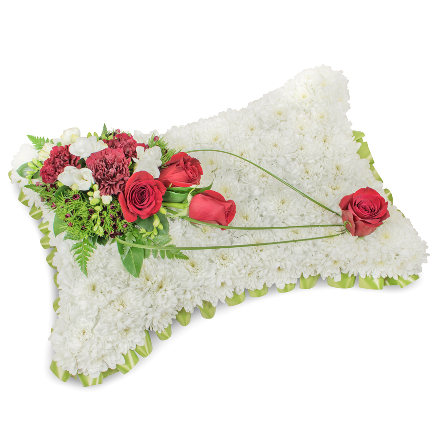 Greet your loved ones with a refined bouquet designed to convey deep compassion and heartfelt sympathy. Our arrangement expertly combines white chrysanthemums, vivid red roses, graceful white freesias, deep red carnations, intricate dianthus, and soft bear grass for a display of natural splendor.