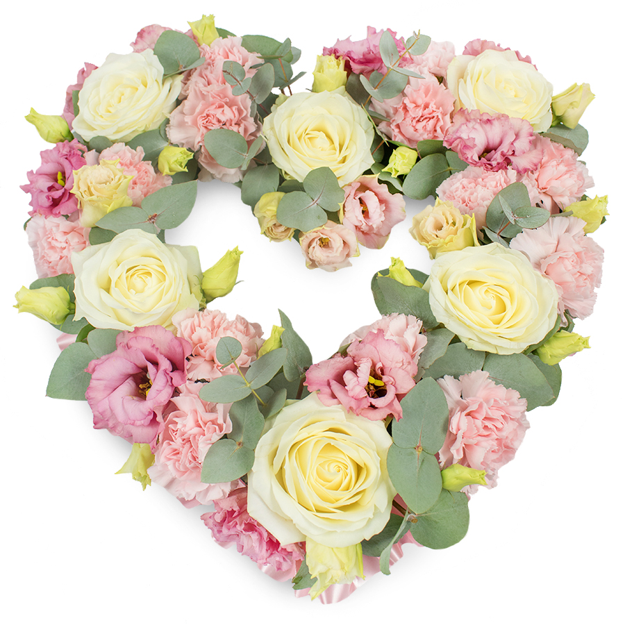 Express your deepest emotions with our exquisite open heart floral arrangement. Featuring a harmonious blend of white roses, pink carnations, pink lisianthus, and eucalyptus foliage, this bouquet is a true symbol of love and remembrance.